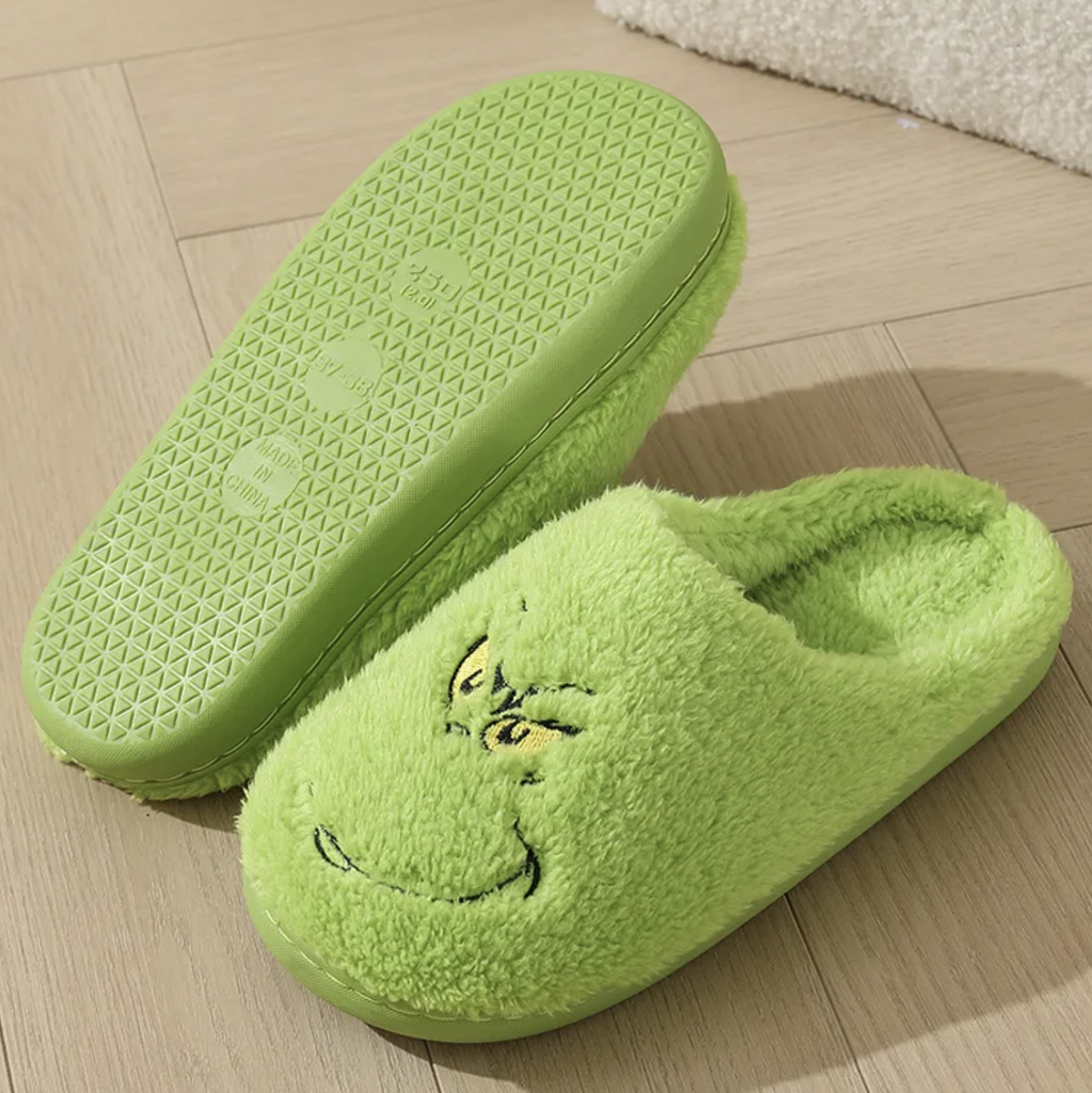 Slip into the spirit of the season with these delightfully grinchy fuzzy green slippers! Perfect for anyone who embraces their inner curmudgeon during the holidays, these cozy companions feature plush green fabric that's as soft as it is festive. Whether you're lounging by the fireplace, padding through the house, or plotting to steal Christmas (just kidding!), these slippers deliver comfort with a mischievous twist. Ideal for holiday movie marathons, gift exchanges, or making a hilariously grumpy fashion statement. Get ready to warm your feet and your heart—even if you pretend not to care!