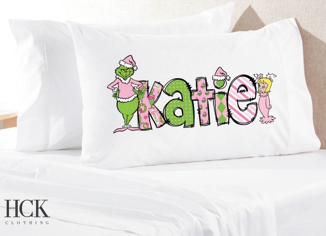 PERSONALIZED- Pink & Green Grinchy Standard Pillow Case - is backordered and will ship as soon as it is back in stock.