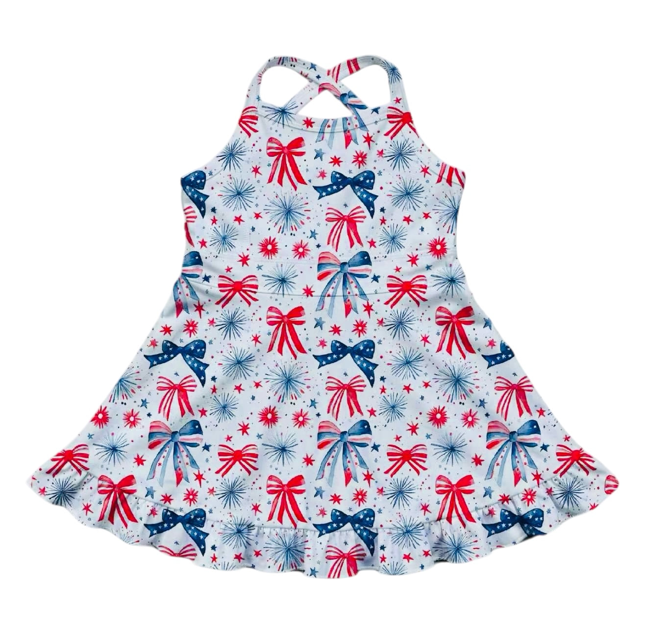 Super soft milk silk fabric blends comfort with durability—95% cotton keeps it breathable while 5% spandex adds gentle stretch for active play. One-piece design features built-in shorts for coverage and convenience, perfect for kids who love to move. Patriotic fireworks print brings festive flair to everyday wear.