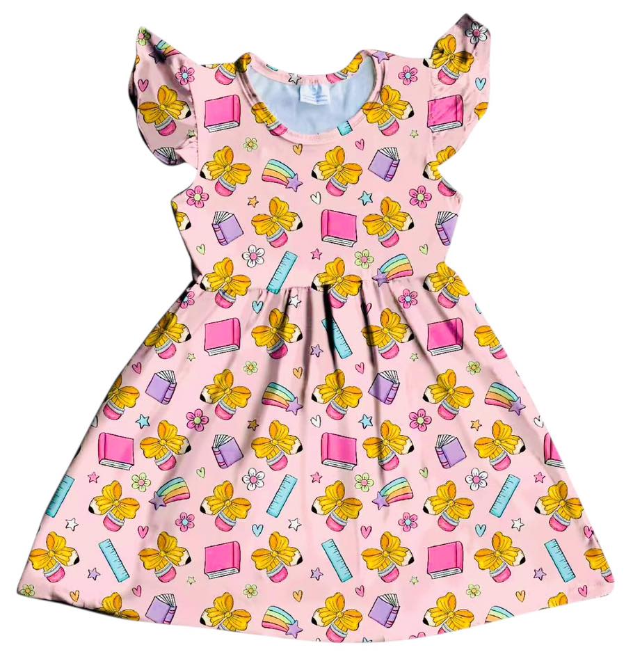 HCK EXCLUSIVE- Pink Pencils & Bows Flutter Sleeve Dress
